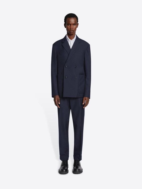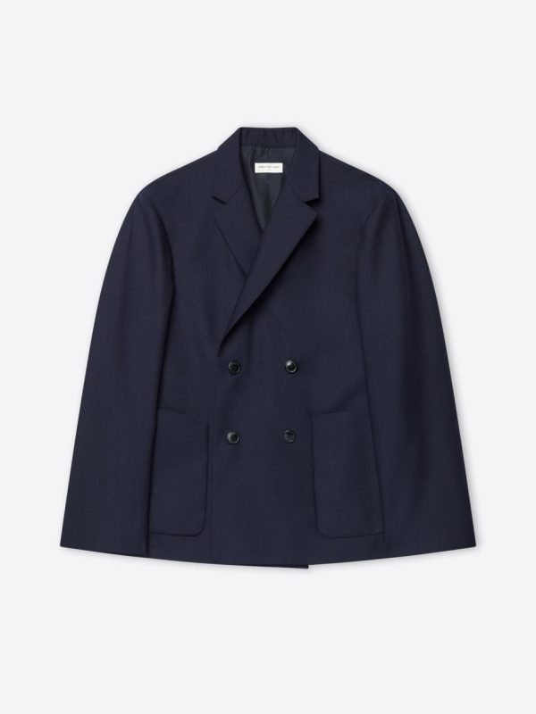 Contemporary boxy fit. Fully lined construction. Sophisticated double-breasted design. Functional front patch pockets. Refined single vent. Secure front button closure.