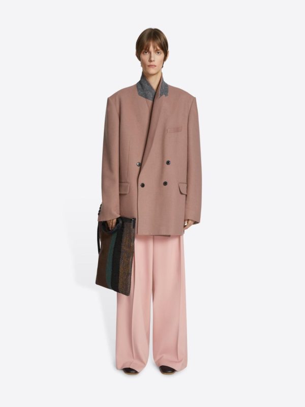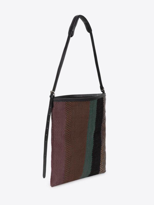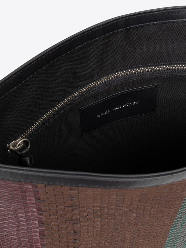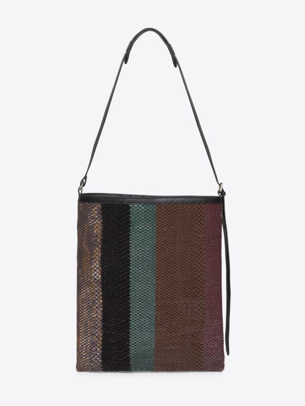 Artisanal upcycled fabric and leather tonal stripes create a unique pattern.