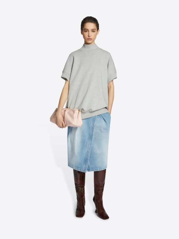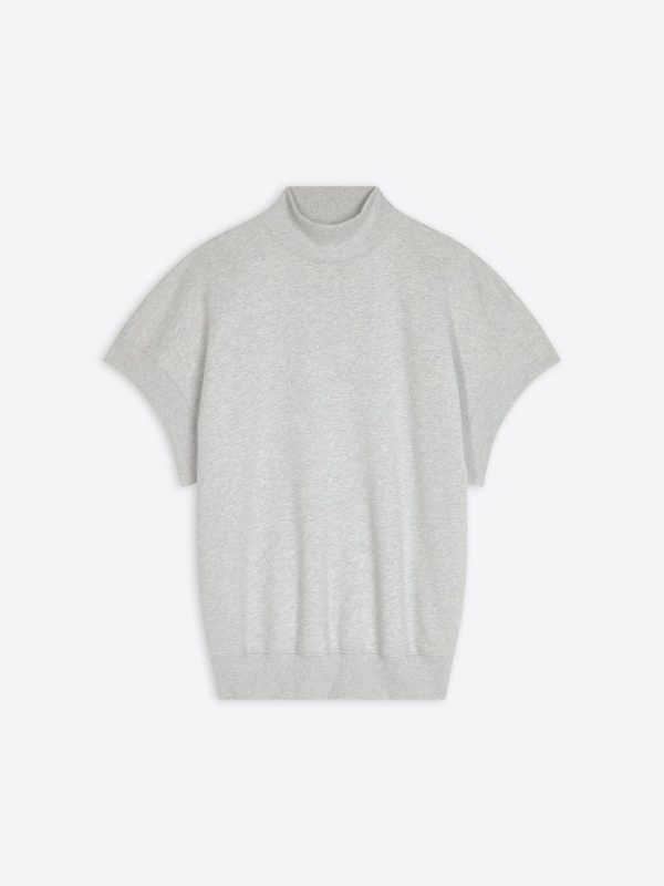 Fashion-forward oversized fit with contemporary dropped shoulder design. Versatile short sleeves. Elegant turtleneck collar.